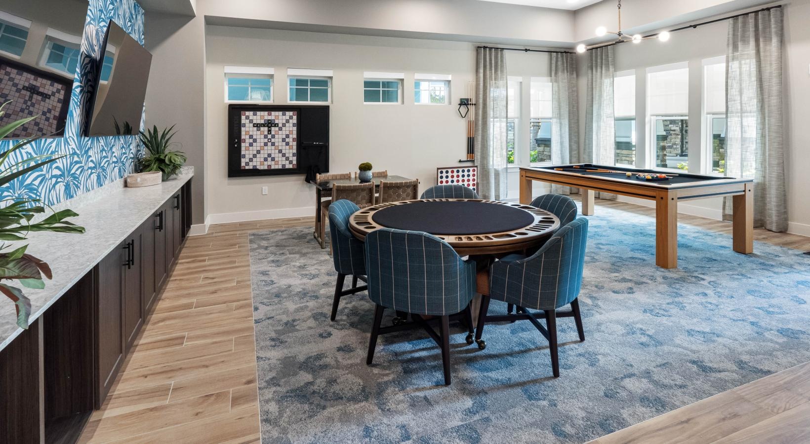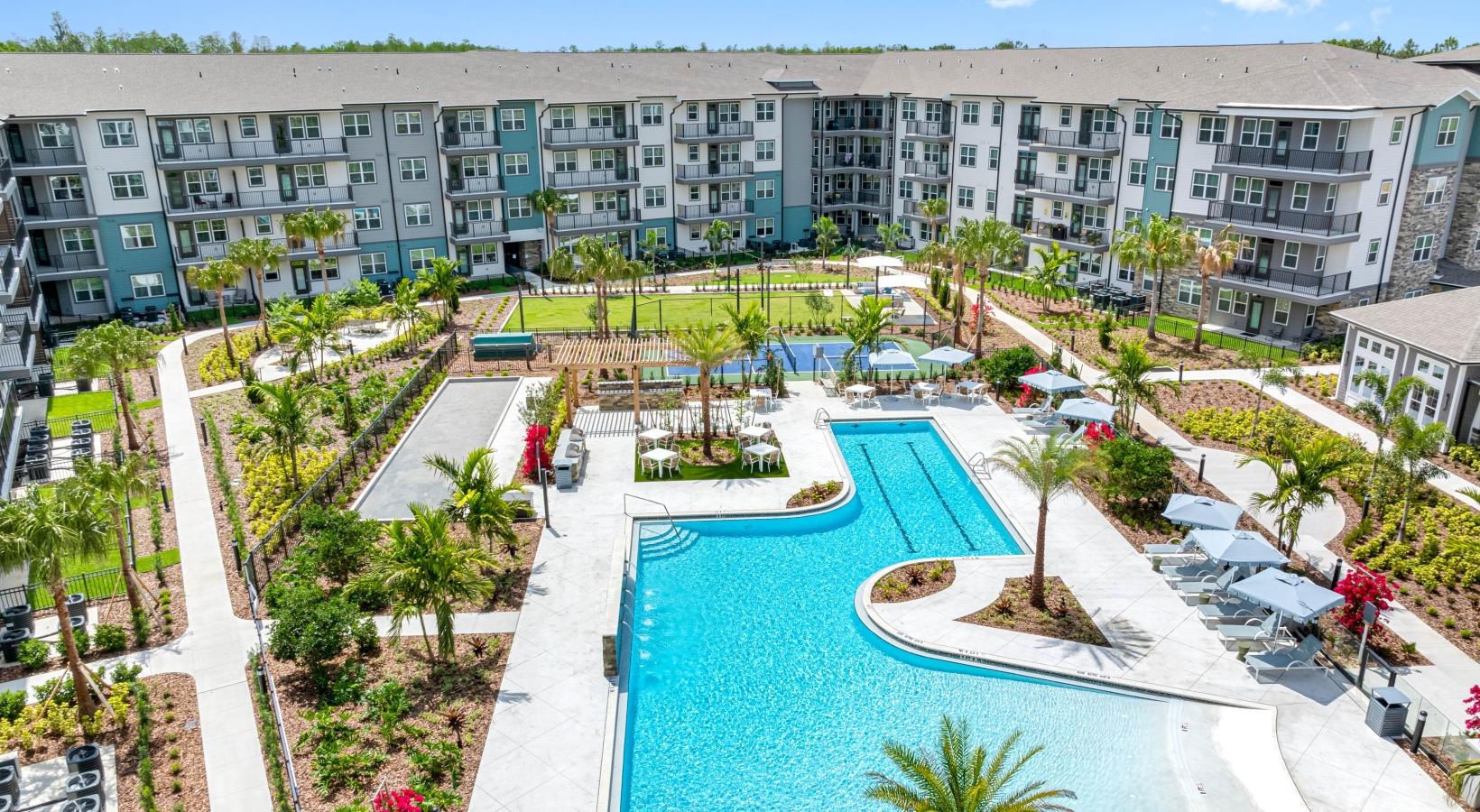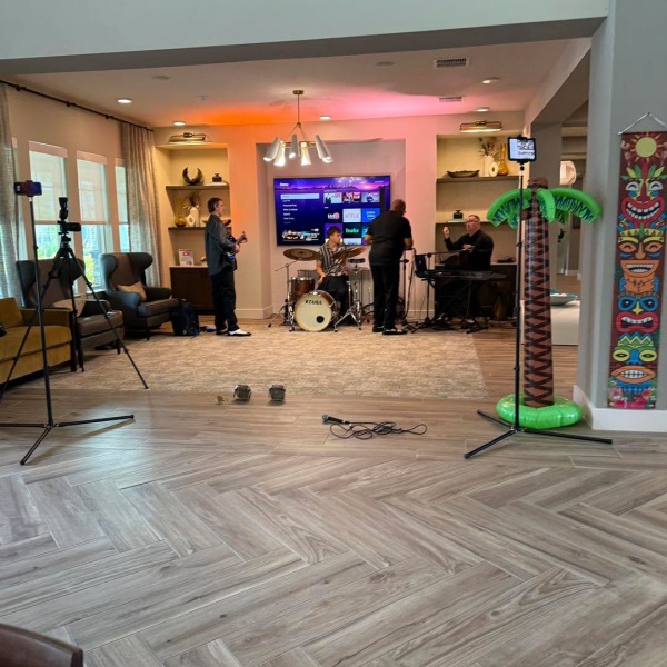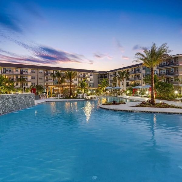 a pool in front of a building with palm trees a dance floor with decorations common eating room with seating three people posing for a picture
