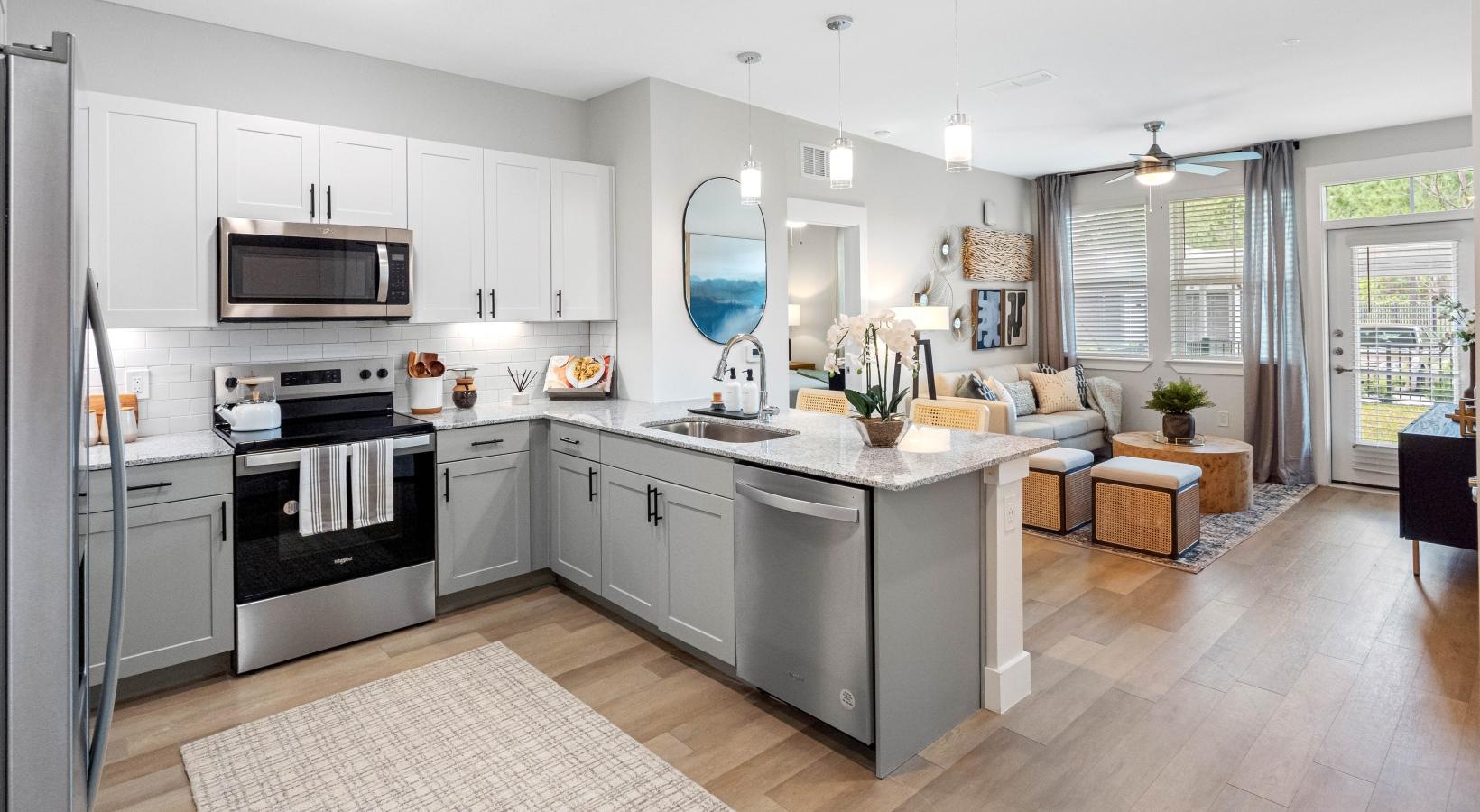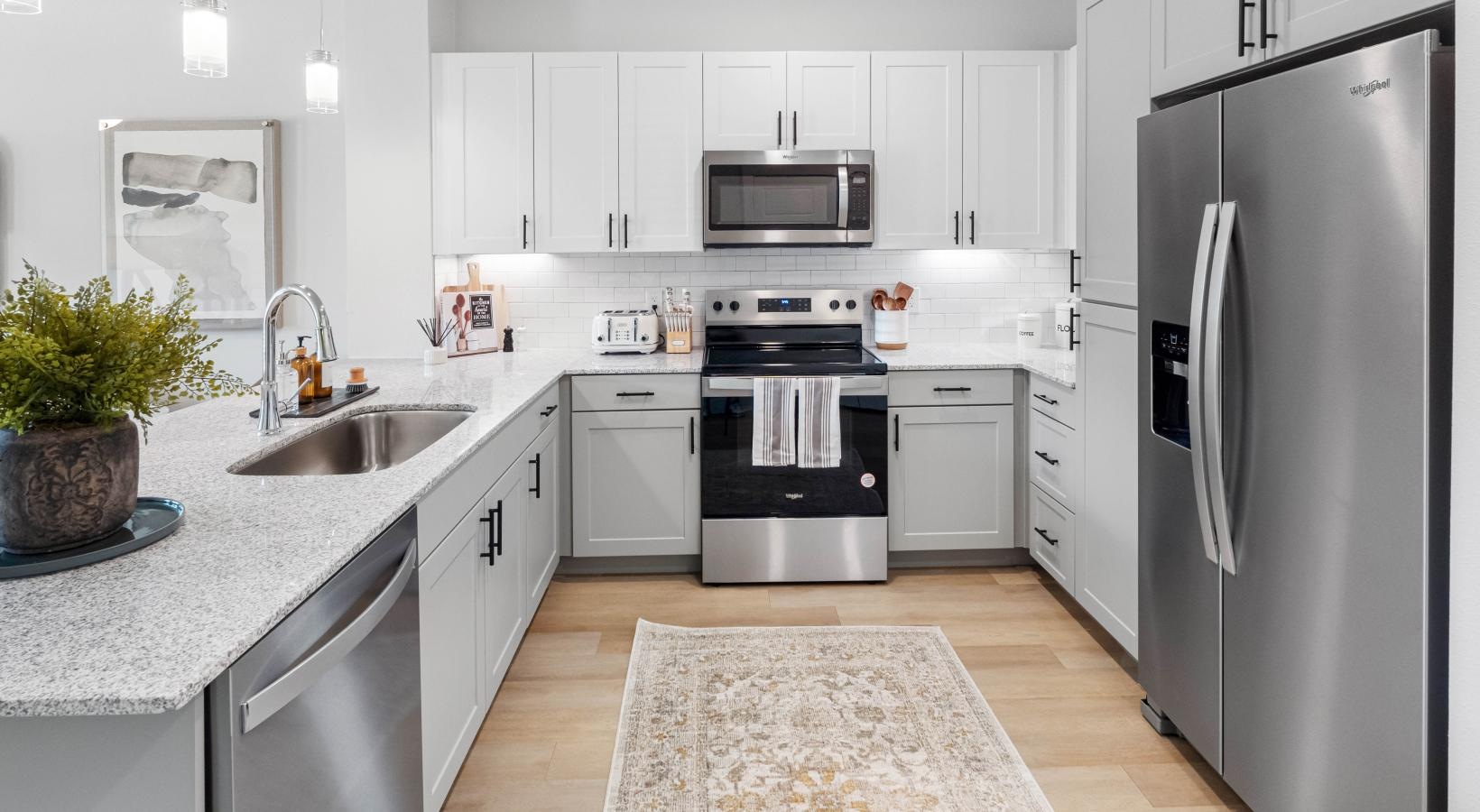 • a kitchen with white cabinets a sink a stovetop and a fridge